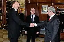 Sargsyan continued the policy towards the peaceful resolution of the Nagorno-Karabakh conflict pursued by his predecessors, which constitutes one of the main goals of the Armenian foreign policy.[38] Sargsyan repeatedly stated that the Armenian side is interested in finding a just and exclusively peaceful solution to the conflict and that the OSCE Minsk Group is the viable format within which the peace talks should continue.[39][40][41] He continued negotiations with Azerbaijan and had a number of meetings with the president of Azerbaijan within the framework of OSCE Minsk Group. On 2 November 2008, Ilham Aliyev and Serzh Sargsyan traveled to Moscow for talks with Dmitry Medvedev. The talks ended in the three Presidents signing a declaration confirming their commitment to continue talks.[42] The two presidents met again in 2009 in Saint Petersburg[43] and on 22 November 2009, together with several world leaders, in Munich where President Aliyev once more threatened to resort to military force to reestablish control over the region if the two sides did not reach an agreeable settlement.[44]