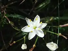 The Kerry lily is a perennial plant reaching a maximum height of 25 cm (10 in). It has a vertical rhizome and fleshy roots. The leaves grow from the base of the plant and are up to 30 cm (12 in) long; they are narrow, linear and grass-like, and sometimes curl. The inflorescence is a sparsely-branched, erect, wiry stem bearing a few small leaves and a loose spike of three to ten flowers with six tepals. The flowers are 2 cm (0.8 in) in diameter, purple-grey in bud and gleaming white when they open. The six stamens have fuzzy white filaments tipped by yellow anthers. The fruit is a three-lobed capsule. The Kerry lily flowers in May and June.[4][5]