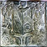 Above are shown the arms of Bampfylde impaling Copleston (Argent, a chevron engrailed gules between three lion's faces azure).