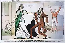 1887 cartoon of Hicks Beach ("Mickey the Botch") being dragged to the House of Commons by Erin.