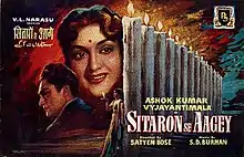 Sitaron Se Aagey (transl.Ahead of the Stars) is a 1958 Hindi Black-and-white family film written and directed by Satyen Bose. The film starred Ashok Kumar and Vyjayanthimala, with Johnny Walker, Rajasulochana, Shammi, Jagdish Sethi, Manmohan Krishna and Leela Mishra in supporting roles. The film was produced by V. L. Narasu. The film's score was composed by S. D. Burman with lyrics provided by Majrooh Sultanpuri. Editing was done by Bimal Roy and it was filmed by K. H. Kapadia.