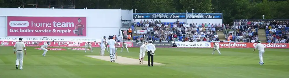 On 11 April 2008, the England and Wales Cricket Board (ECB) announced that the venue would host a series of major Test matches over the next four years. It would host its first Test match on 8 July 2009 as the opening match of an Ashes series between England and Australia.[6] This made Sophia Gardens the 100th Test match venue. In July 2011, the ECB stripped the ground of its right to host the 2012 West Indies Test because of Glamorgan's late payment of the £2.5 million fee it owed for hosting the 2011 Sri Lanka Test.[7] The ground was originally set to host a Test match against New Zealand in 2013, but this was given up in exchange for the 2013 Champions Trophy.[4] The ground was chosen as the venue for the first Test of the 2015 Ashes series.[8]