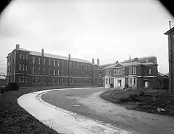The hospital was founded as Arbour Hill Military Hospital and built in three stages from 1902 replacing an older military hospital on the site. Designed by the Royal Engineers of the British Army, it was named the King George V Hospital (‘KGVH’) to mark the 1911 coronation and Irish visit of the king before it opened in 1913 and was administered by the Royal Army Medical Corps (RAMC). It was part of an extensive complex of British military and support facilities west of Dublin city centre for the British garrison in Ireland. This included the Royal Barracks, to which it was connected by a tunnel via Arbour Hill Detention Barracks (built to hold military offenders), Marlborough Barracks, Montpelier Hill Barracks and Isolation Hospital, and the Royal Irish Constabulary Depot in the Phoenix Park. It was transferred to the authorities of the new Irish Free State in 1922. The hospital was renamed after Saint Bricín of Tomregan, because of his skill as a surgeon in 7th century Ireland.[2]