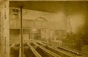 The interior of the old church in 1874, showing the post-Reformation extension and box pews.