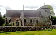 The churchyard is very large, reflecting the size of the parish.[1][12] Burials include Catherine Matcham, one of Lord Nelson's sisters;[15] and a table-tomb dated 1615 is one of the oldest such graves in Sussex.[1] There are also wooden graveboards, sometimes used as a cheaper alternative to gravestones,[16] and a pair of gate-like iron grave-markers.[1] The lychgate at the north entrance was erected in 1903.[6] A very broad yew tree, known to be over 600 years old, occupies part of the churchyard behind the church.[1]