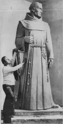 Kangas began by visiting the Santa Barbara and Ventura missions to study images of Serra and to learn about his life and style of dress. He also made multiple sketches in preparation for the work.[5] The sculpting process began with the creation of a full-size clay model; the clay model took four months to complete and was built at Kangas's studio at 3929 Fountain Avenue in Los Angeles.[6] The clay sculpture was built around a frame of wood and chicken wire which Kangas then covered with layers of clay.[2]: 6 According to a contemporary of the artist, Kangas used Meiners Oak resident Gordon Douglas as a model for the face of Serra.[2]: 3 In August 1936, the Los Angeles Times published on its front page a large photograph of Kangas posing with the clay sculpture.[6]