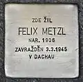Felix Metzl was born in Třeboň on 13 April 1906 as a son of Emilie and Ludwig Metzl. He had five siblings and worked as a tradesman. On 18 April 1942 he was deported to Theresienstadt by Transport Akb, Nr. 751 from České Budějovice. From there, he was deported to Auschwitz on 1 October 1944 by Transport Emm, Nr. 254. He was murdered in Dachau concentration camp on 3 March 1945.