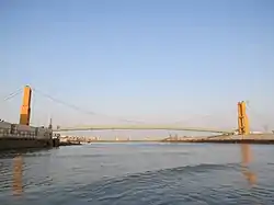 A pedestrian bridge over Gomti river connects Jagat Mandir of mainland Dwarka and Panchnad or Panchkui Tirth on the island in southeast of it. The bridge was proposed in 2005 to boost tourism on the island. The island has religious as well archaeological significance. There are five sweet water wells called Panchkui associated with five Pandava brothers of Mahabharata. Gomti river was crossed by boats until construction of the bridge.[3][4][5][6] As Jagat Mandir is an Archaeological Survey of India (ASI) protected site, permission was needed for construction of the bridge. The Vadodara circle of ASI gave a nod to the bridge in 2008.[3][7] The ground breaking ceremony for the bridge was held on 5 May 2011 by Gujarat Tourism minister Jaynarayan Vyas and Rajya Sabha MP Parimal Nathwani.[8] The construction was delayed due to ASI Delhi not granting the permit until 2013.[9][10] The bridge was completed in February 2016.[11][5][12][13]