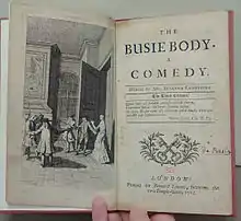 Centlivre's skill in such roles charmed many men, especially Mr Fox, who would soon become Centlivre's first husband when she was sixteen. However, he died less than a year later.[7] Following Fox's death, Centlivre is claimed to have married an army officer named Carroll, who died in a duel a year and a half after their union. She kept the name Carroll until her next marriage.[8] Although much of her early years is speculation, biographers agree that Susanna's knowledge was predominantly self-acquired through reading and conversation. Looking at her use of French drama, it is not hard to see that Centlivre also had a sound knowledge of the French language.[9] After her husband's death, Centlivre spent much of her time in London, where she turned to writing partly for financial support.[10]