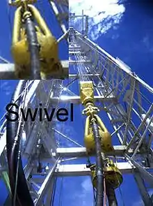 A Swivel is a mechanical device used on a drilling rig that hangs directly under the traveling block and directly above the kelly drive, that provides the ability for the kelly (and subsequently the drill string) to rotate while allowing the traveling block to remain in a stationary rotational position (yet allow vertical movement up and down the derrick) while simultaneously allowing the introduction of drilling fluid into the drill string.