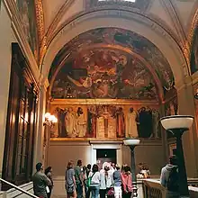 Synagogue is an allegorical mural by John Singer Sargent in the Boston Public Library.[1] It is part of Sargent's larger Triumph of Religion mural cycle in the library's central branch at Copley Square. Synagogue was unveiled in 1919, and it sparked immediate controversy.[2] The cowering and feeble personification of the Synagogue stood in contrast with Sargent's glorified depiction of the Church in the mural cycle, and members of the Jewish community observed that the series delivered an implicit message of Jewish decline and Christian triumph.[2] Sargent was reluctant to respond publicly to criticism of the work, but privately wrote in 1919, "I am in hot water with the Jews, who resent my ‘Synagogue,’ and want to have it removed– and tomorrow a ‘prominent’ member of the Jewish colony is coming to bully me about it and ask me to explain myself. I can only refer him to Rheims, Notre Dame, Strasbourg and other Cathedrals, and dwell at length about the good old times."[2]:233 Responding to charges that the work was antisemitic, the Massachusetts legislature passed a bill ordering the removal of the mural in 1922, but the law was soon repealed, and the work has remained in place.[2]:236