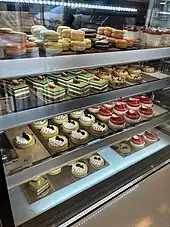 Sandwich options have included chicken, pork, chicken, Oregon rockfish, and wagyu beef, all with shokupan (Japanese milk bread). The restaurant has also served a vegan option with oat milk, which Jackson-Glidden said in 2022 was the city's only dairy-free milk bread option. The menu has also included Japanese fruit sandwiches with milk bread and whipped cream, dorayaki, macarons (such as pistachio and ume varieties), matcha and miso croissants, mochi doughnuts, and coffee.[3] Other pastries have included "black-sesame-raspberry Paris Brest, yuzu meringue tart with shiso and blackberries, a pyramid of pistachio sponge with raspberry compote and dark chocolate mousse."[6]