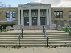 The building was designed by architect Albert A. Osburg and engineer William C. E. Becker.[2] Osburg served as the chief of the Public Improvement Board for the city of St. Louis,[4] and also designed the nearby Homer G. Phillips Hospital.[5] It is an Art Deco-style building has a T-shaped plan with a buff brick exterior, decorative limestone and terracotta details.[2] The interior layout of the building has some Classical Revival design aspects.[2] Most of the stem of the "T" shape is a gymnasium space for sports, with community services at the far south end.[2]