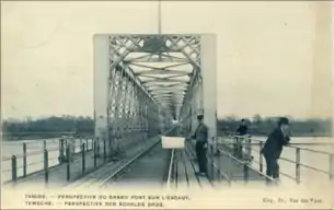 The first bridge across the Schelde at Temse was ready for use on 30 November 1870. It was designed by the French engineer Gustave Eiffel. Eiffel's 343 m (1,125.3 ft) bridge was primarily a railway bridge, carrying the line from Mechelen to Terneuzen. However, beside the railway line, on each side of it, was a toll path for pedestrians and their animals.[3] Tolls were set in 1872 at 15 centimes for a horse or cow, 10 centimes for a donkey, 5 centimes for a person and 3 centimes for one goat or two ducks. Later in the century, the bridge was also used by small horse carts and dog carts. Towards the end of the century motor cars began to appear on the streets, but anyone wishing to cross the river with a car had to drive upstream to Dendermonde.[3]