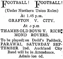 They departed on the Friday evening with 300 excursionists. There were four teams in total, including the Grafton Athletic and City Rovers fifth-grade sides to play a curtain-raiser, and the Thames Old Boys second-grade side which was playing against Richmond Rovers at 3pm. The games were played at Dodd's Paddock at Parawai, which is the southern part of present-day Thames township. The sides were accompanied by Dick Benson, the Auckland Rugby League president, Mr. Thompson, to referee, and the Auckland City Brass Band, which played music at the ground.[26] The Thames Old Boys won their match by 11 points to 5. Davidson scored for Thames in the first half and followed with a second in the second half. Schofield then scored and converted his own try. A report from Thames that appeared in the Auckland Star said that the "first-half was a little scraggy, but the second was a good exhibition of the league game, it being fast and open". The Thames Star said "Thames possessed greater speed, and many times outpaced their opponents. From start to finish the game was very willing, and the spectators witnessed some good play".[27] The Davidson who scored twice for them was most likely Bill Davidson who also travelled with the sides as he was representing the Junior Advisory Board, and no player with the surname Davidson had played for Thames Old Boys during the season. Davidson was aged 19 but had already played for the City Rovers senior side and would go on to represent New Zealand from 1919 to 1921.[28] City won the fifth-grade match by 3 points to 0.[29][30]
