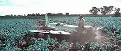 Hughes crashes in a field; screenshot showing the simulated bipack color film used in scenes depicting events before 1935