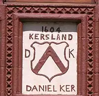 Over the main entrance door of the dwelling house is a carved stone removed from the old manor house bearing the arms of the Ker family, with an inscription "Daniel Ker Kersland - 1604". This date stone has been touched-up with paint.[6] Karrisland (sic) is recorded on Timothy Pont's map c. 1604, as are the placenames Karshead, Todsle, Dysil, and Achingry.[7] In 1685 'Carsland' is shown.[8] The property had been surrounded by trees and had a orchard of considerable extent.[9] Kersland Mains was on the entrance lane from Dalry and became Wester Kersland Farm when the manor house/castle was demolished.