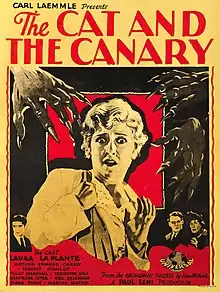 Although not the first film set in a supposed haunted house, The Cat and the Canary started the pattern for the "old dark house" genre.[31] The term is derived from English director James Whale's The Old Dark House (1932), which was heavily influenced by Leni's film,[15] and refers to "films in which murders are committed by masked killers in old mansions."[32] Supernatural events in the film are all explained at the film's conclusion as the work of a criminal. Other films in this genre influenced by The Cat and the Canary include The Last Warning, House on Haunted Hill (1959), and the monster films of Abbott and Costello and Laurel and Hardy.[33][34]