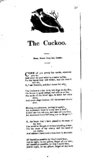 "The Cuckoo" was published as a broadside by London and provincial printers, but does not seem to have been common. Broadsides are not precisely dated, but the earliest in the Bodleian Ballad Collection was published between 1780 and 1812 CE, the latest before 1845. The broadside texts are similar, of five verses starting with a "Come all ye" warning about courting sailors and with the cuckoo appearing in the second verse.[12][13][14]