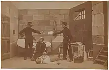 "Shows the interior of the cell of the Prison Militaire du Cherche-Midi, Paris, where Colonel Henry is confined. He is seated at a table writing a letter, on completion of which he rises and takes a razor out he had concealed in his porte-manteau, with which he cuts his throat. The suicide is discovered by the sergeant of the guard and officers."