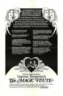 The Magic Flute (Swedish: Trollflöjten) is Ingmar Bergman's 1975 film version of Mozart's opera Die Zauberflöte. It was intended as a television production and was first shown on Swedish television on 1 January 1975, but was followed by a theatrical release later that year. The work is widely viewed as one of the most successful films of an opera ever made,[1][2][3][4] and as an unusual item among the director's works.[5] The film won BAFTA TV Award for Best Foreign Television Programme in 1976[6] and was nominated for Golden Globe for Best Foreign Language Film.