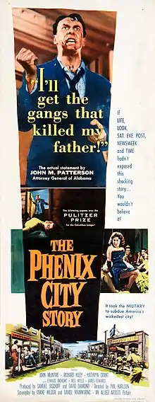 The Phenix City Story is a 1955 American film noir crime film directed by Phil Karlson[3] for Allied Artists, written by Daniel Mainwaring and Crane Wilbur and starring John McIntire, Richard Kiley, and Kathryn Grant.[4] It had a triple premiere held on July 19, 1955 in Phenix City, Alabama, Columbus, Georgia, and Chicago, Illinois.[5]