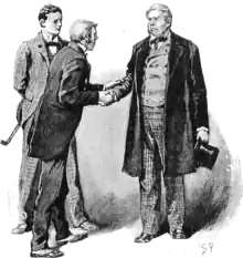 ![]() Duncan Ross shakes Jabez Wilson's hand with Vincent Spaulding looking on, 1891 illustration by Sidney Paget | |||