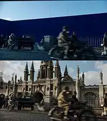 There are 1,400 special effects shots that were made for The Voyage of the Dawn Treader,[31] more than The Lion, the Witch and the Wardrobe's 800 and fewer than Prince Caspian's 1,500 shots. Angus Bickerton served as the lead visual effects supervisor of the film while Jim Rygiel, who supervised the effects on The Lord of the Rings film trilogy, worked as the senior visual effects supervisor.[32] British visual effects companies the Moving Picture Company, Framestore CFC, and The Senate VFX were hired to create the visual effects alongside Cinesite and The Mill.[33] Moving Picture worked on the dragon Eustace and the Dawn Treader. They say the dragon is "amongst the most heroic characters ever created, and is scheduled to be featured in around 200 shots of the movie." They also revised Reepicheep from the previous film by saturating his color, giving him bushier eyebrows and ear hair, and made his whiskers a little more wiry just to give him a sense of age. Framestore also revised Aslan, changing his color palette to be a more realistic lion than a golden lion and adding a darker mane; they also created 16 different dufflepuds to replace Jonathan Fawkner and Angus Bickerton running around first as dufflepuds on the set; The Senate worked on the opening shot of King's College, Cambridge, as well as the star effect on Liliandil at Ramandu's Island; Cinesite worked on the Dark Island, and Fugitive Studios did the end titles and credits, which featured original drawings created by Pauline Baynes for the Narnia books.[32] These illustrations were included because the film's creators wanted the credits to have visual interest, and also because they wished to include an acknowledgement to Pauline Baynes, who died in August 2008.[34]