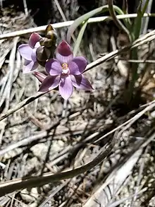 Thelymitra hatchii, commonly called Hatch's sun orchid,[2] is a species of orchid in the family Orchidaceae that is endemic to New Zealand. It has a single erect, deeply channelled, dark reddish green leaf and up to eight mauve or pink flowers. The lobe on top of the anther is red with a yellow top and the arms on the sides of the column have tufts of pale yellow hairs.