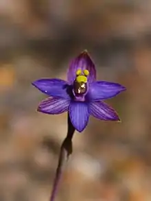 Thelymitra matthewsii, commonly called the spiral sun orchid[2] or spiral leaved sun orchid,[3] is a species of orchid in the family Orchidaceae and native to New Zealand and Australia. It has a single erect leaf, spiralling around the flowering stem and a single dark purple flower with darker veins and yellow ear-like arms on the sides of the column.