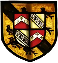 The heraldry is as follows: top left, Luttrell; top right (arms of George's son, Thomas), Luttrell impaling Argent, on a chief gules two stag's heads cabossed or (Popham), also visible in Marshwood House, Blue Anchor; centre (arms of George Luttrell),[16] Luttrell quartering: quarterly of four, 1&4: Gules, on a chevron or three cross crosslets sable(Hadley), 2&3: Or, on a bend cotised sable three horse's heads and necks argent bridled or (Durborough of Withycombe).[15]