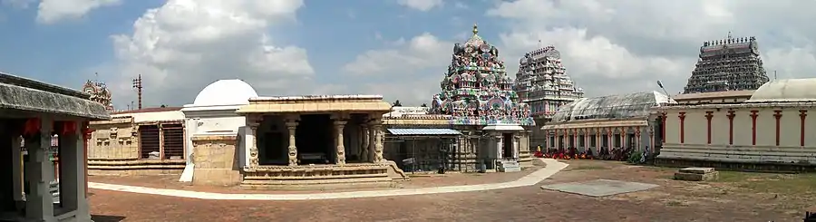 The temple complex occupies an area of around 17 acres (6.9 ha) with the Kamalalayam tank to its west, which occupies the same area. The temple has nine gopurams, 80 vimanas, twelve temple walls, 13 halls, fifteen large temple water bodies, three gardens, and three large precincts. The major gopuram of the temple is seven-tiered and raises to a height of 118 ft (36 m).[15] The two main shrines of the temple are for Vanmikinathar (Shiva) and Thyagarajar. Of the two, the former is the most ancient and derives its name from tha anthill (putru), which takes the place of linga in the main shrine. Appar, the 7th-century poet-saint, refers to the main deity in his hymn as Putritrukondan (one who resides in the ant hill). The Stala vriksham (temple tree) is red patiri (trumpet flower tree). The principles and practices of tree-worship and philopatry are ancient bases whereupon a later date linga worship seems to have been established.[16]