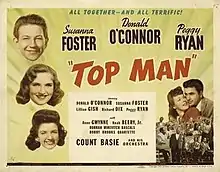 Top Man (also known as Man of the Family) is a 1943 American black-and-white musical comedy film directed by Charles Lamont and starring Donald O'Connor, Susanna Foster, Lillian Gish, Richard Dix, and Peggy Ryan.[2] It was O'Connor and Ryan's first film away from the third of their trio, Gloria Jean.