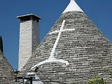 The symbols now visible on a row of trulli in via Monte Pertica (cross, pierced heart, host with rays radiating from it, tree, dove symbolising the Holy Spirit, and crescent with a cross) were painted only in the late twentieth century and the early 2000s when the roof cones were renovated.[14]
