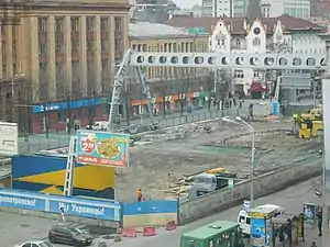 The station was already envisioned in the 1980 official planning of the city's metro lines (the station was to be named "Ploshcha Lenina").[2] It was originally scheduled to be opened in 1993 as Ploshcha Lenina (Ukrainian: Площа Леніна), the station's construction was delayed significantly after the fall of the Soviet Union.[3] Budget issues and economic instability in Ukraine further delayed the station's opening.