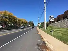 US 230 was extended north to US 11/US 15/US 22/US 322 (Front Street) along the Susquehanna River in Harrisburg in the 1930s. The route continued north on Cameron Street and became concurrent with a rerouted US 22 at State Street. From here, the two routes headed north along Cameron Street and west on Maclay Street to Front Street.[12] In the 1940s, the US 22 concurrency along Cameron Street was removed while the route became concurrent with US 22 Byp. along Maclay Street.[13] In 1949, US 230 was shifted north to a new multilane alignment between Salunga and PA 72 north of Lancaster before it ran southwest on Dillerville Road, southeast on Harrisburg Avenue, and south on Prince Street.[13][14][15] In 1953, US 230 was rerouted to head east to US 30 east of Lancaster along a newly-constructed freeway bypassing Lancaster to the north. The freeway began at the PA 72 interchange and continued east to US 30.[16][17][18]