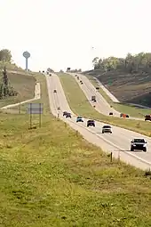US-59 is a 210-mile-long (340 km) highway which runs from south to north in eastern Kansas. It enters the state from Oklahoma south of Chetopa and passes through Parsons, Ottawa, Oswego, Moran, Garnett, and Lawrence. The route leaves Kansas for Missouri by crossing the Missouri River at Atchison. Most of the route climbs the cuestas of the Osage prairie,[2] while north of the Kansas River, it cuts through the glaciated region.[3]
