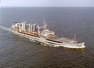 On 27 January 1964, Waccamaw got underway for Seattle, Washington, and arrived on 21 February. During a seven-month yard period, she received the oiler equivalent of "framming", "jumbo conversion."[1] During this conversion the midsection of the ship (all the cargo tanks) was removed and a new midbody (100 feet longer than the original was inserted. All the steam winches were removed and replaced with "state-of-the-art" replenishment equipment including new cargo pumps.