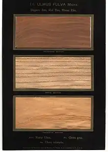 The timber is not of much importance commercially, and is not found anywhere in great quantity.[7] Macoun considered it more durable than that of the other elms,[28] and better suited for railway ties, fence-posts, and rails, while Pinchot recommended planting it in the Mississippi valley, as it grows fast in youth, and could be utilized for fence-posts when quite young, since the sapwood, if thoroughly dried, is quite as durable as the heartwood.[29] The wood is also used for the hubs of wagon wheels, as it is very shock resistant owing to the interlocking grain.[30] The wood, as 'red elm', is sometimes used to make bows for archery. The yoke of the Liberty Bell, a symbol of the independence of the United States, was made from slippery elm.