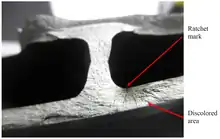 The metallurgical examination of the fractured fan blade was accomplished at P&W's Materials Laboratory in the presence of members of the Powerplants Group as well as an NTSB metallurgist. The examination revealed a fatigue fracture that had initiated from a subsurface origin on the interior surface of the hollow core fan blade. The origin of the crack was in an area where the basal planes of the crystals were all similarly aligned and were almost perpendicular the localized stress field when the fan blade was formed. The examination also revealed that the fan blade's material conformed to the specified titanium alloy's requirements.[12]