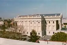 The windows are rectangular with pediments. The portico entrance doors are also pediment-ed. The buildings were topped with an entablature with architrave and an unadorned frieze with a dentiled cornice. The building has a low roof with an open balustrade.[2][3]
