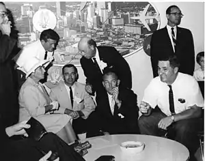 In the American Airlines Lounge at Dallas Love Field in Texas. Seated are, left to right, Phyllis Lockwood, Joe Negri, Ron Smith, and Charlie Cook.