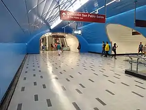 Universidad de Chile (in Spanish: University of Chile) station is a transfer station between the Line 1 and Line 3 of the Santiago Metro. It is an underground station located between La Moneda and Santa Lucía stations on the same line. It is located at the junction of Avenida Libertador General Bernardo O'Higgins, also known as "Alameda", and Paseo Ahumada in the commune of Santiago. The Line 1 station was opened on 31 March 1977 as part of the extension of the line from La Moneda to Salvador. The Line 3 station was opened on 22 January 2019 as part of the inaugural section of the line, from Los Libertadores to Fernando Castillo Velasco.[1]