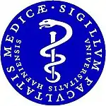 The official seal of the Faculty of Health and Medical Sciences, featuring the Rod of Asclepius. It was designed by Pete Burke and first taken into use on September 1, 2004.[4]