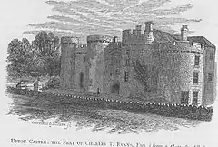 In the second half of the 18th century, Captain John Tasker of the East India Company purchased Upton Castle; among the eventual beneficiaries after his death were members of the Evans family.[6] In 1833, Lewis, in his Topographical Dictionary of Wales, recorded that the parish was occupied by a single family of six inhabitants. At that time Nash-cum-Upton was a rectory in the non-adjoining Nash parish, to the south. Lewis described the former inhabitants of the castle and its dependencies as Maliphant (sic), then Bowen, then Evans.[2] In 1872, Upton was described as a hamlet in Nash parish, with a population of 24 in three houses. It covered an area of 435 acres (176 ha), 105 acres (42 ha) of which were water.[7]