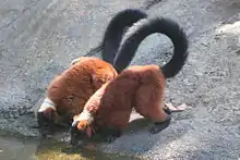 This primate typically lives in small, matriarchal groups of 2–16 individuals, but group sizes of up to 32 have been recorded. Its diet consists primarily of fruit, nectar, and pollen. Leaves and seeds may be eaten when fruit becomes scarce.[6] Red ruffed lemurs will sometimes form large groups during the wet season when food is plentiful. They will all find one food source and forage together as a group. During the dry season they will often separate and find food on their own when fruits are scarce . This is unusual behavior as most other diurnal lemurs will stay together and forage in large groups even during the dry season.[6] Field studies suggest that red ruffed lemurs, like black-and-white ruffed lemurs, may be found in monogamous pairs or in small, organized groups. Individuals out in the forest communicate through loud booming calls, which can be heard over considerable distances.[9]