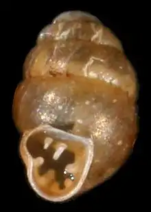 Aperture is semioval, contracted or sinuous in the middle of the outer edge; teeth six or seven, viz. two on the pillar [parietal wall], two on the pillar lip (the inner one of which is always larger, and the outside one tubercular and placed in the angle where the outer lip joins), and two or three within the outer lip (the third, when it is present, placed near the pillar lip and being a mere tubercle:) outer lip rather thick and slightly reflected, strengthened by a strong rib both outside and inside, which is situate near the opening of the mouth and is yellowish-white; outer edge rather abruptly inflected; inner lip slightly thickened in full grown specimens; umbilicus small and narrow, contracted by a rather sharp and gibbous crest or ridge at the base of the shell.[4]