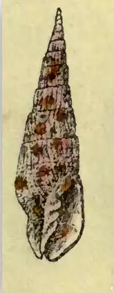A whitish, pyramidal-turreted species with a produced acuminate spire. It is ornated with irregular rows of chestnut spots. The whorls are slightly convex with longitudinal smooth ribs. The short aperture has a narrowed base. The outer lip is dilated anteriorly. The columella is five-plaited. [2]