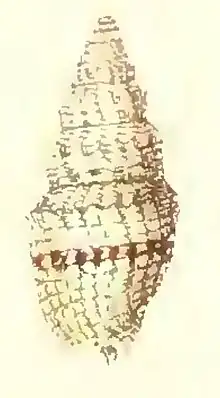 (Original description) The rather thick shell is elongately ovate. The spire is turreted. The whorls are angulated at the upper part, longitudinally ridged, ridges numerous, narrow, transversely impressly grooved. The shell is white, encircled with a brown band between the ridges only. The columella is four-plaited, uppermost plait much the largest . The aperture is rather short. [2]