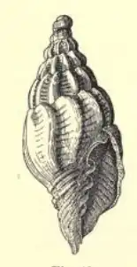 Sculpture: on the body whorl are six roundly swelling arcuate ribs, which arise at the suture and terminate at the basal constriction, but disappear on the final half whorl. The anti- penultimate whorl has thirteen ribs. On ascending the spire, the ribs become comparatively more prominent, and on the earliest whorl are sharply constricted and angled at their upper third. On each whorl they alternate with those above and below. Between the ribs appear delicate and evenly-spaced, spiral grooves. Seven or eight broad, close, flat-topped lyrae are obliquely wound around the base. The protoconch is two-whorled, globose, projecting on the right side, smooth. Anteriorly a spiral groove forecasts the constriction of a later whorl. In the unique specimen the outer lip is broken. The columella bears a tubercle at the posterior angle, it is then excavated. The moderately straight columella carries four, con spicuous, projecting plaits. A callus is spread over the preceding whorl. The throat is on its outer wall corrugated by a dozen raised spiral lines.[3]